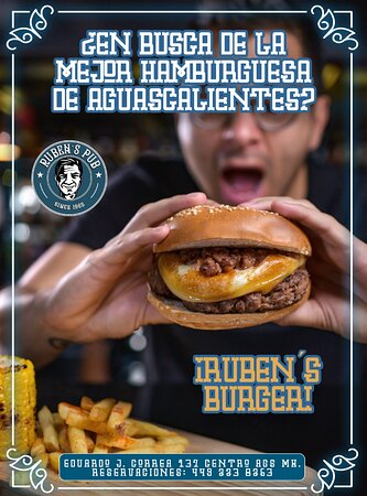 Te recomendamos visitar Ruben’s Pub Aguascalientes, un establecimiento de comida rápida en donde podrás degustar ricas hamburguesas caseras, pizzas, hot dogs, albóndigas envueltas en tocino con queso, papas a la francesa con variedad de salsas, nachos, entre otros platillos.